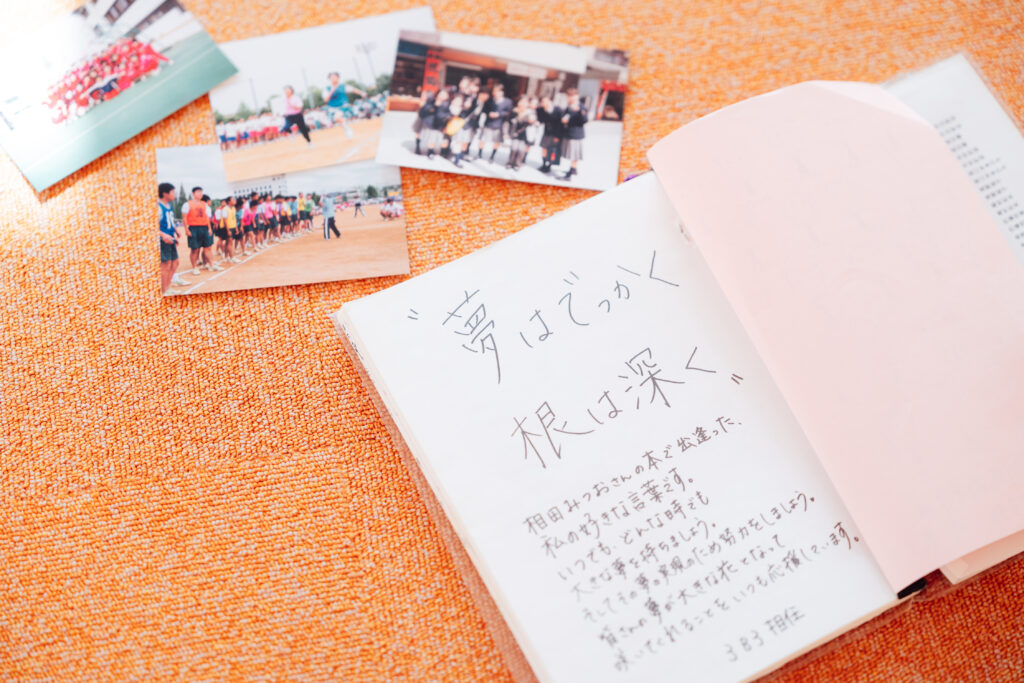 私がずっと心に置いているのは、相田みつをさんの「夢はでっかく 根はふかく」という言葉です。教諭時代には、卒業新聞にこの言葉を添えて「大きな夢を持つこと。そして、その夢を支えるのは、目に見えない日々の努力なんだよ」と生徒たちに伝えていました。
